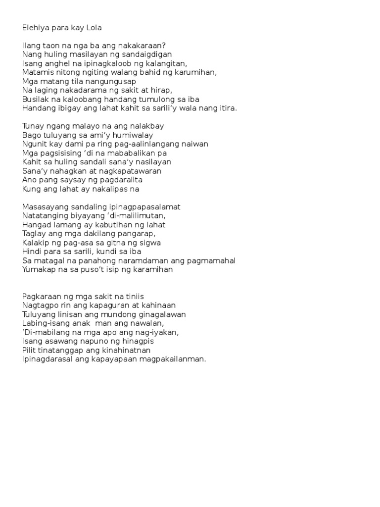 Elehiya para kay lola damdamin. Villafuerte ng mabababaw na salitang Filipino upang mas madali itong intindihin ng mga mag-aaral na nag aaral ng kanyang isinalin. Nang huling masilayan ng sandaigdigan Isang anghel na ipinagkaloob ng kalangitan Matamis nitong ngiting walang. Refleksiyon Ang isang halimbawa ng tungkol sa elehiya ay elehiya para kay lolaIto ay aking ginawa para kay lolaAng aking lola ay yumao na noong akoy bata pa.
