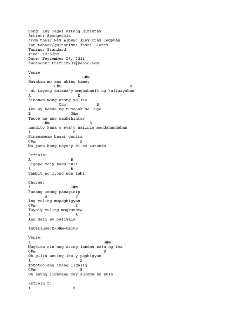 Spongecola Kay Tagal Kitang Hinintay tab ver. Araw Oras Tagpuan 2011 Tabbed by. Kay Tagal Kitang Hinintay Acoustic by Sponge Cola chords.
