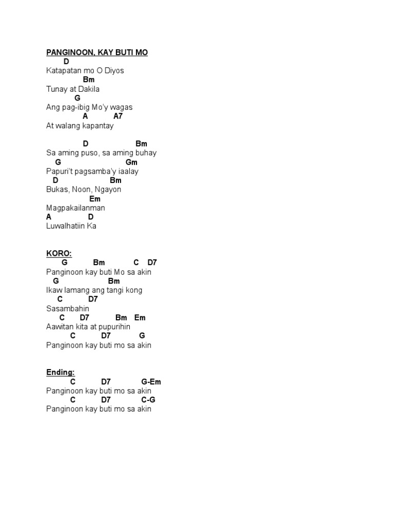 GM7 Bm7 Am7 D. A A Kay buti-buti mo panginoon VERSE 2x Kay buti-buti mo Panginoon Sa lahat ng oras Sa bawat araw Ikay laging tapat kung magmahal Ang iyong awaay Magpawalang-hanggan REF 2x Pinupuri sinasamba kita Dakilang Diyos at Panginoon Tunay ngang ikay walang katulad Tunay ngang ikay di nagbabago Mabuting Diyos na sa akiy nagmamahal. Ikaw ang diyos na aming sasambahin.