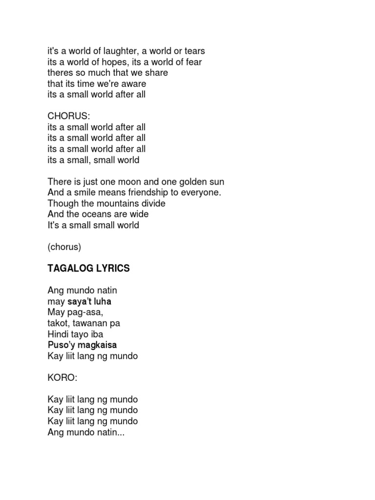 Its a small world after all Its a small world after all Its a small world after all Its a small small world Tagalog Ang mundo natin may sayat luha May pag-asa. Human translations with examples.