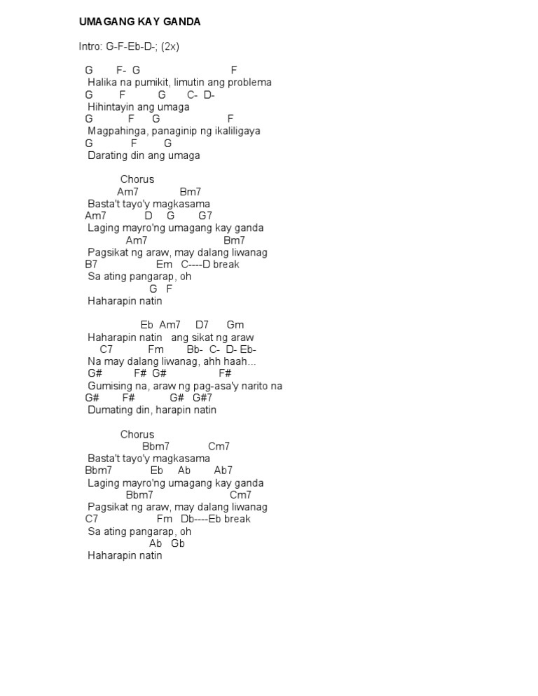 1 Umagang Kay Ganda - Chorus Lyrics Halika na pumikit limutin ang problema Hihintayin ang umaga Magpahinga panaginip ang ikaliligaya Darating din ang umaga Chorus Bastat tayoy. Umagang Kay Ganda Lyrics Halika na pumikit limutin ang problema Hihintayin ang umaga Magpahinga panaginip ang ikaliligaya Darating din ang umaga Bastat tayoy magkasama. Chorus Bastat tayoy magkasama Laging mayroong umagang kay ganda Pagsikat ng araw May dalang liwanag Sa ating pangarap ooh Haharapin natin Simple lang kasama ka naman Kung.