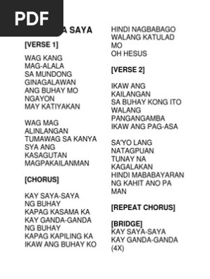 Wag kang mag-alala sa mundong ginagalawan ang buhay mo ngayon may katiyakan wag mag alinlangan tumawag sa kanya sya ang kasagutan magpakailanman kay saya-saya ng buhay kapag kasama ka kay ganda-ganda ng buhay kapag kapiling ka ikaw ang buhay ko hindi nagbabago walang katulad mo oh hesus ikaw ang kailangan sa buhay kong ito. O kay saya at kay ganda. FaithMusic Manila - Kay Saya-Saya.