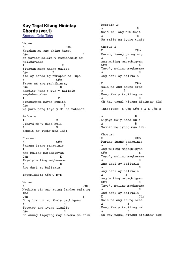 Kay Tagal Kitang Hinintay Sponge Cola Chords and Lyrics for Guitar. There are 60 lyrics related to Kay Tagal Kitang Hinihintay Guitar Chords. Kay Tagal Kitang Hinintay Artist.