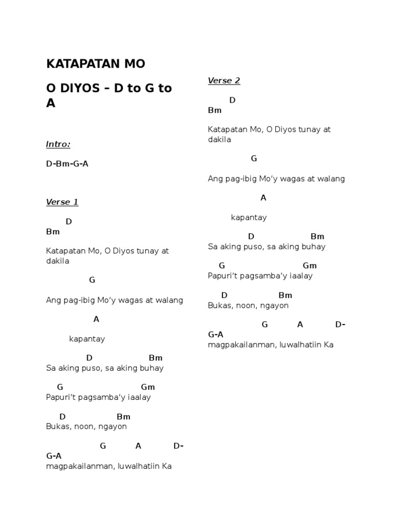 Katapatan Mo o Diyos tunay at Dakila Ang pag-ibig Moy wagas at walang kapantay Sa aming puso sa aming buhay Papurit pagsambay iaalay Bukas noon ngayon magpakailanman Luwalhatiin ka Chorus. Katapatan Mo O Dios tunay at dakila Ang pag-ibig Moy wagas at walang kapantay Sa aming puso sa aming buhay papurit pagsambay iaalay Bukas noon ngayon magpakailanman luwalhatiin ka. Jan 13 2021 Katapatan Mo o Diyos.